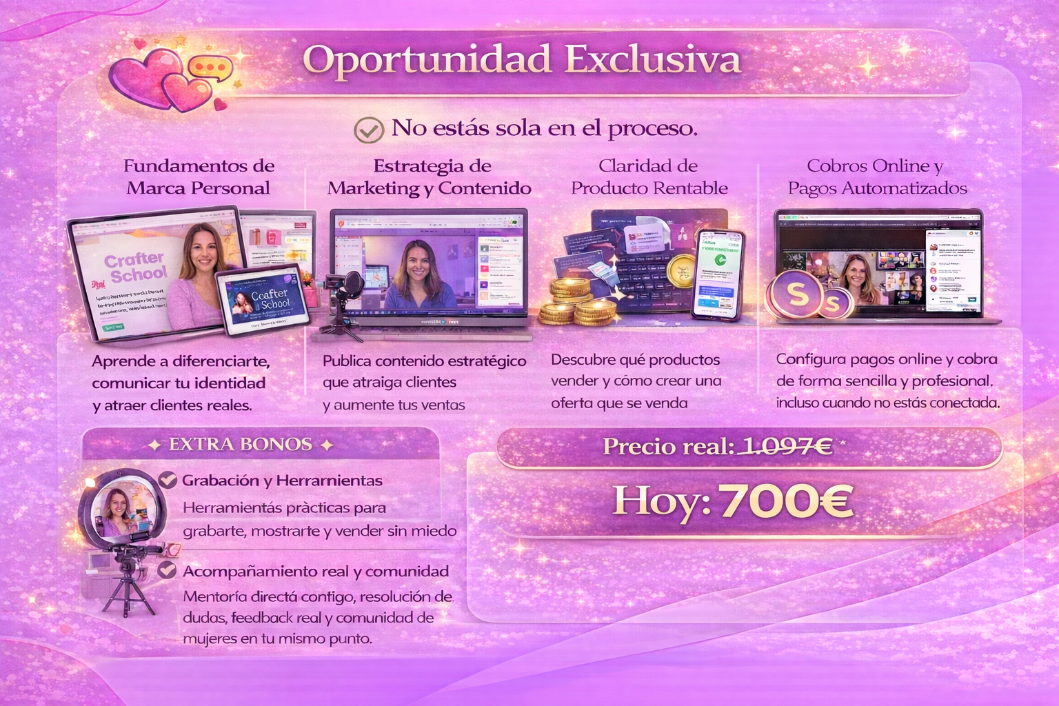 He formado a más de 100 mujeres, he impartido más de 200 horas de formación, y actualmente más de 20 alumnas están dentro de Crafter School, avanzando cada semana.
